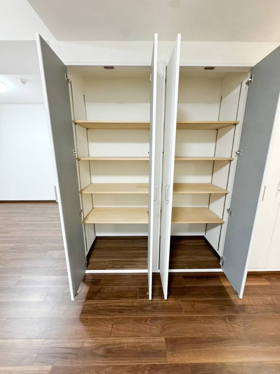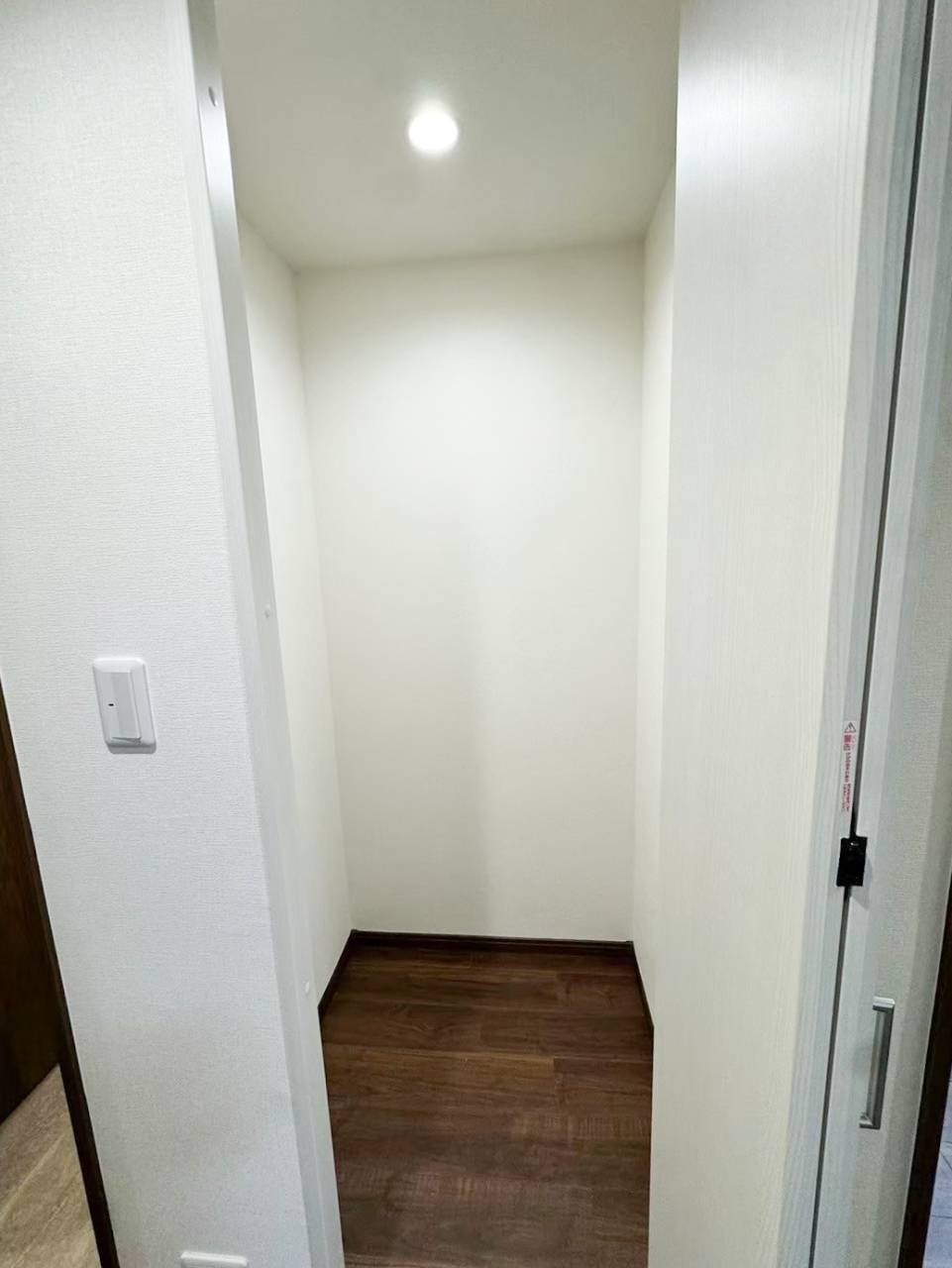 こちらの廊下収納は人がすっぽり入れるほどの十分な奥行きが確保できたため 収納スペース内にはあえて何も棚やハンガーパイプは設置しません。こうすることでご自身でお気に入りの棚ごとクローゼット内に設置することや市販のプラスチック収納で整理することが出来ます。入れるものによって自由自在にアレンジ可能です。また収納スペース以外としての活用も可能になります。