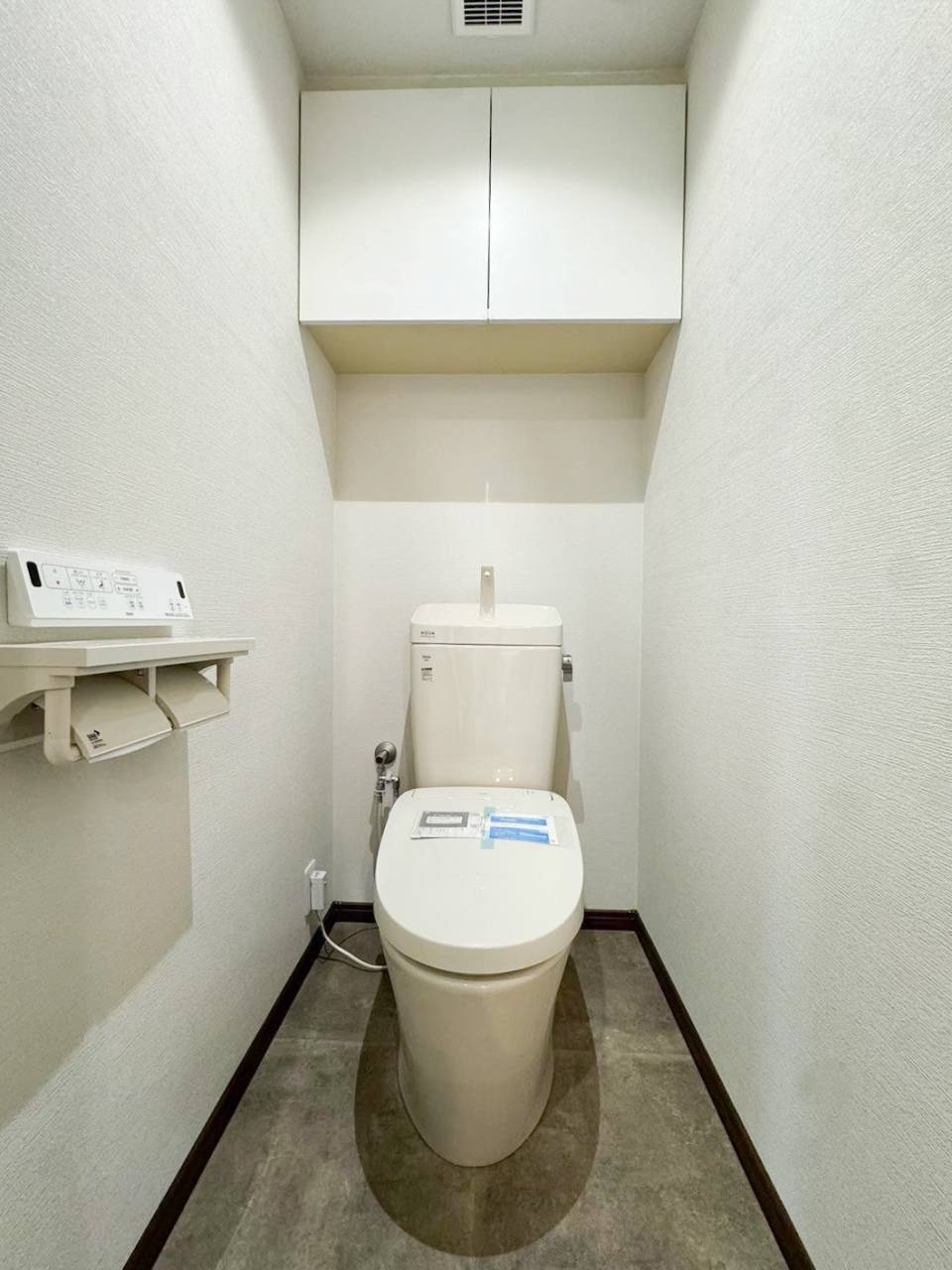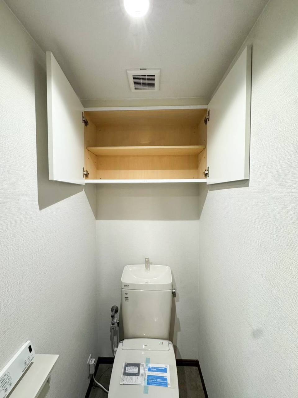 吊戸棚にすることで限られたトイレ内の上部のデッドスペースを有効に使います。