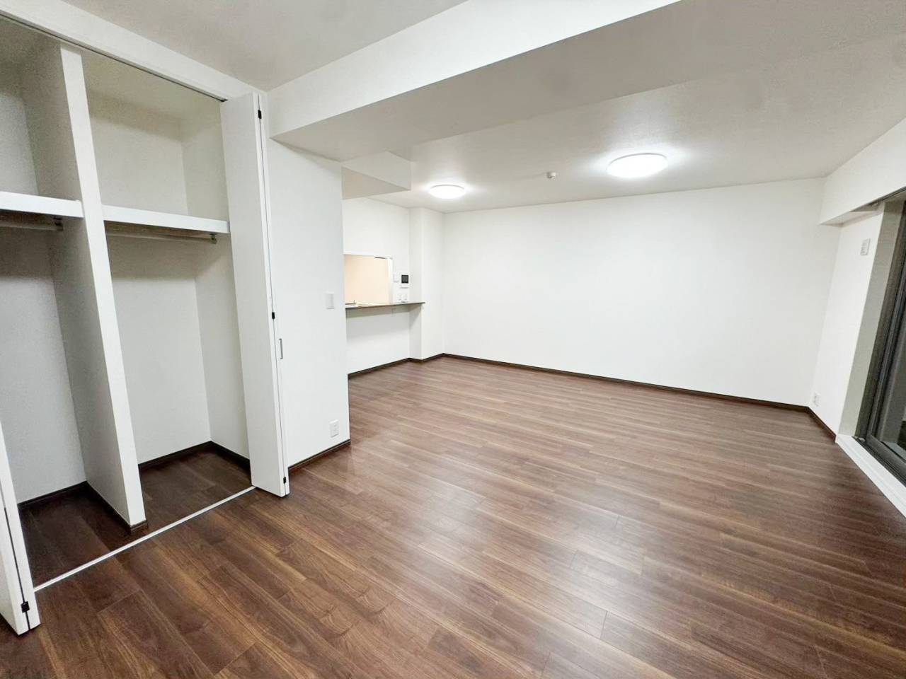 真っ白な壁と天井、収納ドアにウォールナットのフローリングが高級感のあるリビングを演出してくれています。