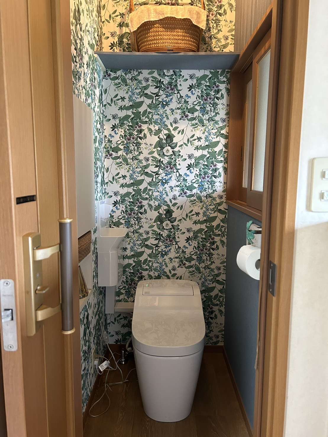 便器はタンクレスのスタイリッシュなデザインのもののため、より柄クロスを引き立ててくれています。