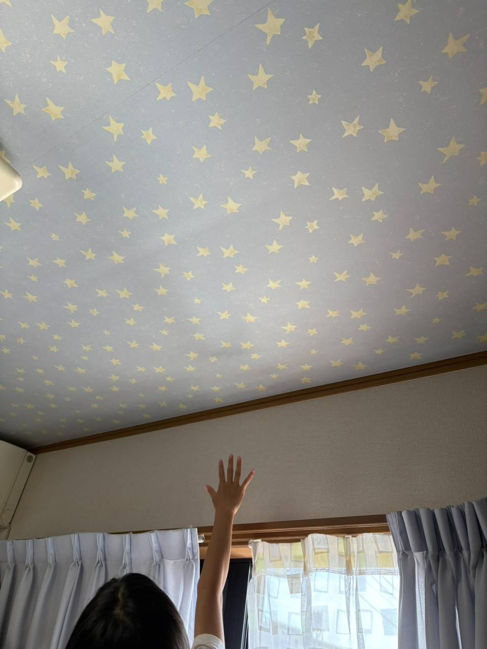 こちらは白色ベースの天井クロスに、月や星のモチーフを組み合わせた上品なデザイン。 月と星の模様がすべて蓄光仕様になっており、夜になると、天井一面に優しく光が広がります。 照明を消すと、月がふわっと浮かび上がり、その周りに小さな星が瞬いて…。 読書が趣味な お姉ちゃんが本を閉じて寝転がりながら、静かに空を眺めている様子は、まるでおとぎ話のワンシーンのようですね。普段はおとなしいお姉ちゃんとのことですが、お部屋全体の壁紙クロスが変わりお部屋がキレイになったことはもちろん、貼り替えた天井の月星模様の壁紙クロス、蓄光クロスに大喜びしていただき、スタッフや職人さん達も大喜び☺