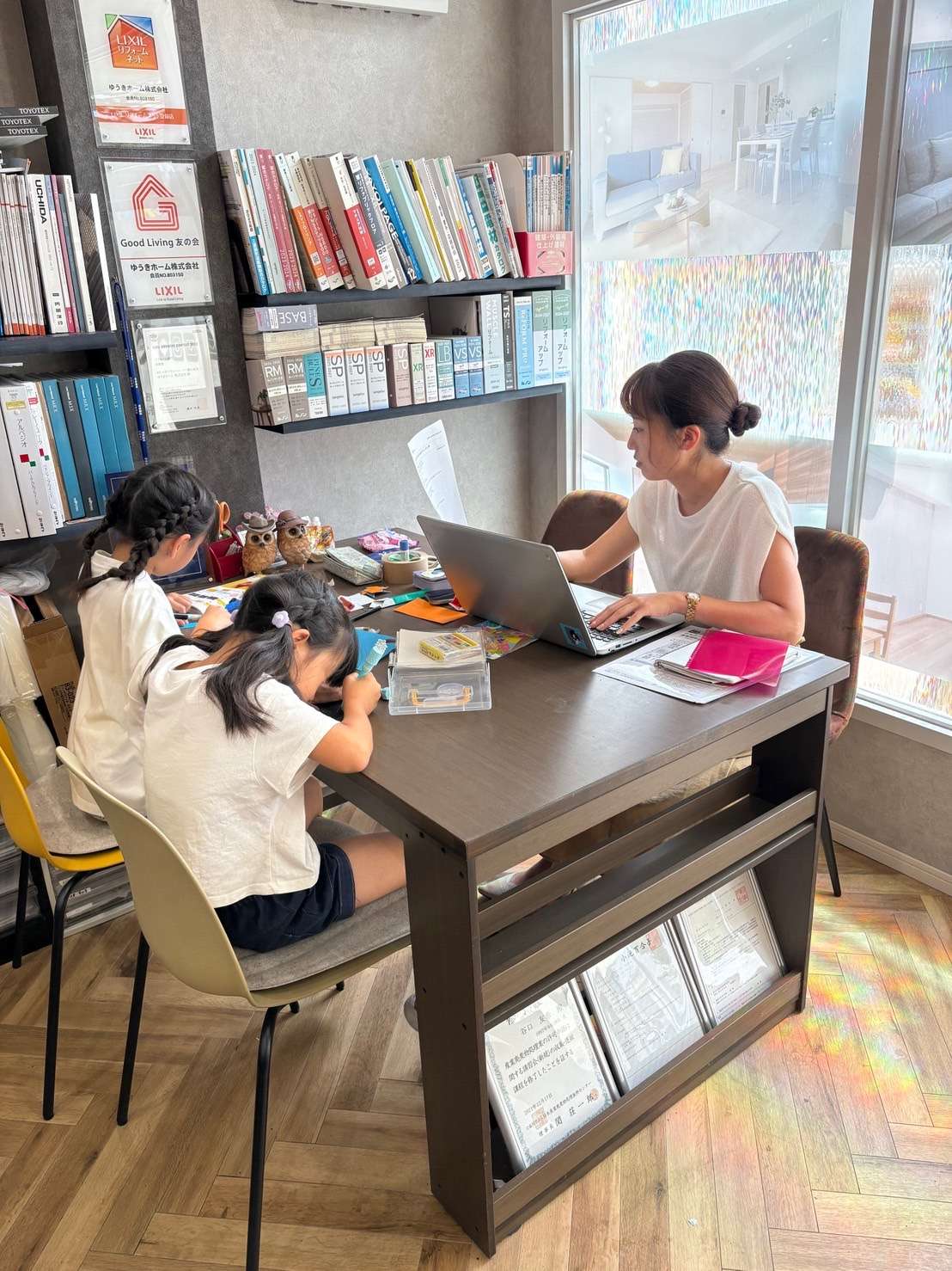 さて、ゆうきホーム株式会社の事務所には、主婦である従業員の姿がありました。彼女の目の前には、小学生の娘さん2人が並び、夏休みの宿題の工作を広げています。