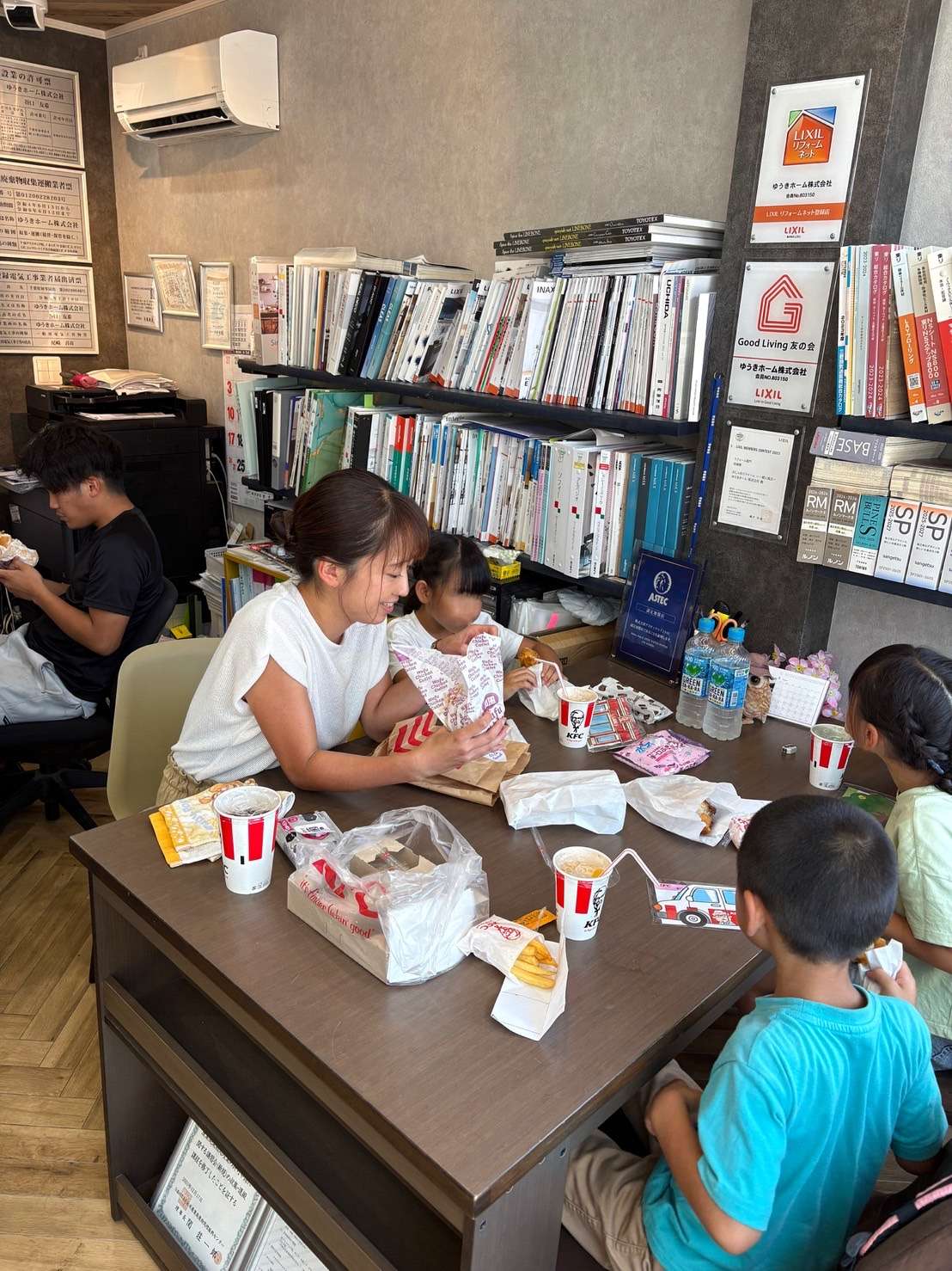 社長がお子さんたちにお昼ご飯何がいいか聞いていただき、お子さんたちは元気に『ケンタッキーがいい♪』とお声をいただき、社長さんと専務さんがケンタッキーを買ってきてみんなでいただきました♪