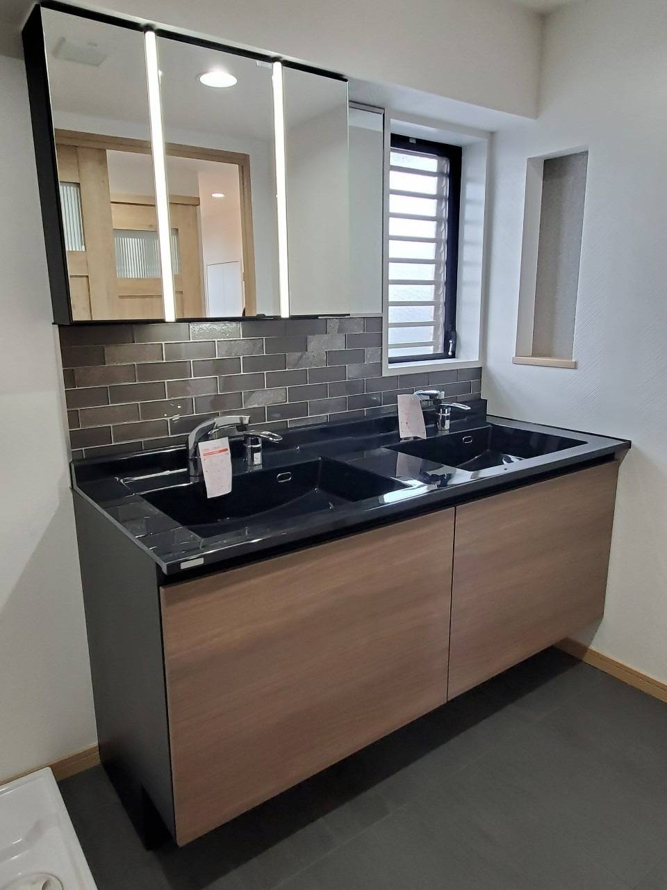 ルミシス × チャコールグレーガラスタイル × グロスウッド扉の洗面台。