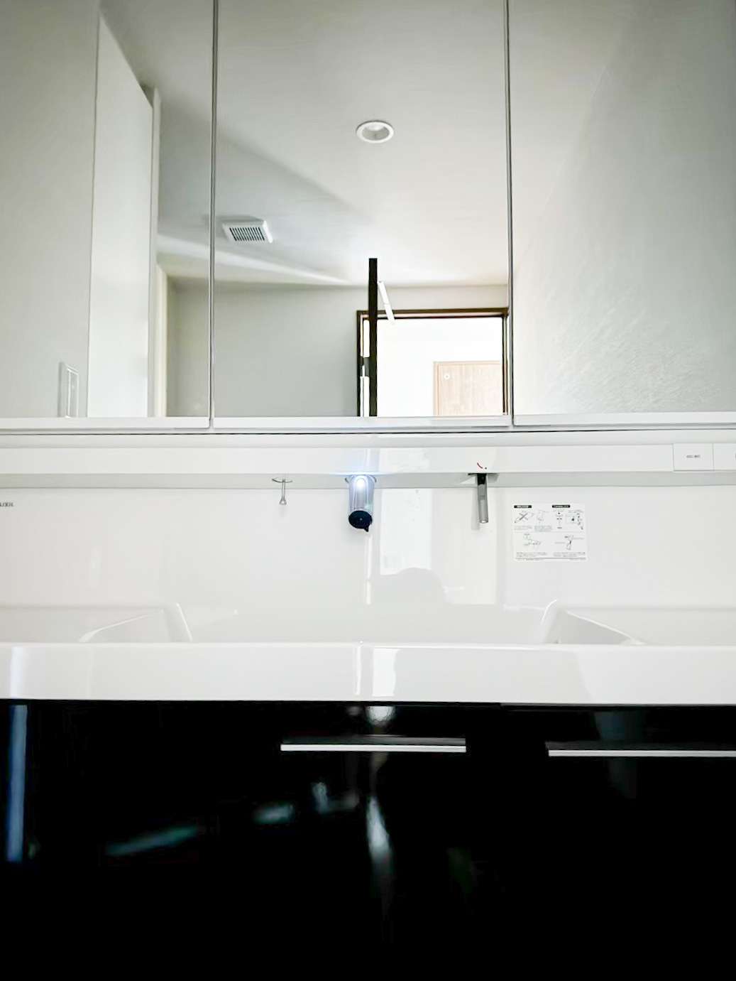 ランドリールームのドアを開けると広々とした空間と正面に高級感溢れる洗面化粧台が見えます。
