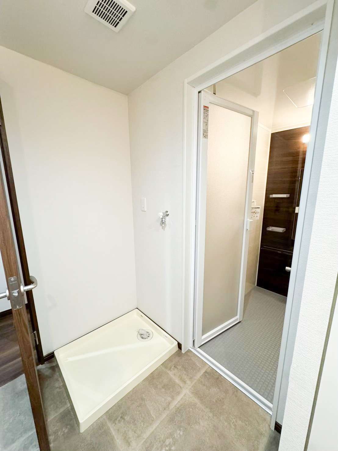 ダークブラウンのドアに明るい照明、そしてほんのりと自然な床の柄が目を引きますね。