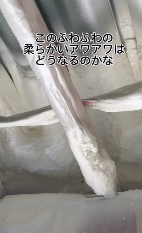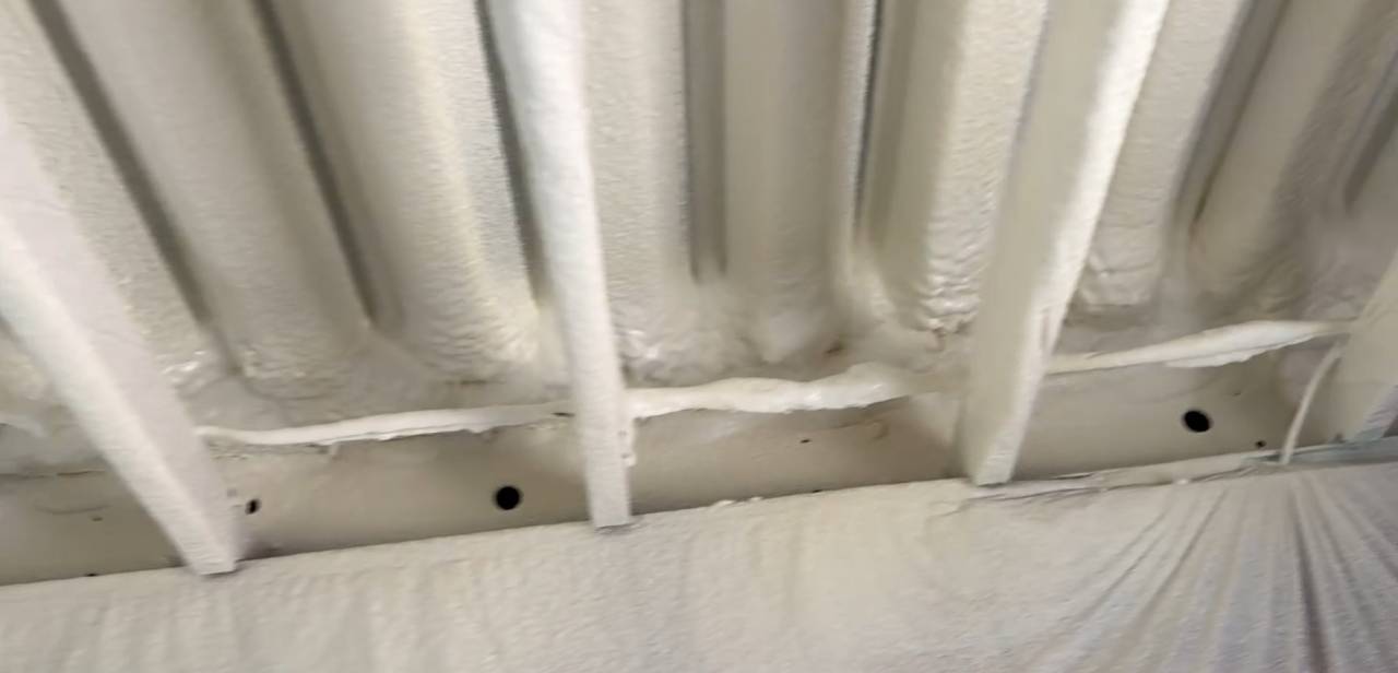 そこでご提案したのが、天井裏全体への硬質発泡ウレタン吹付施工です。施工は2階の天井裏全面と、ベランダ下の天井部分を中心に行いました。硬質発泡ウレタンは発泡することで隙間なく密着し、鉄骨の複雑な構造にも対応できるため、従来の断熱材では難しい部分もしっかりカバーすることが可能です。